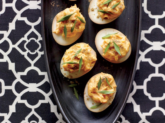 Oeufs mimosa relevés de wasabi, esprit japonais sur la table.